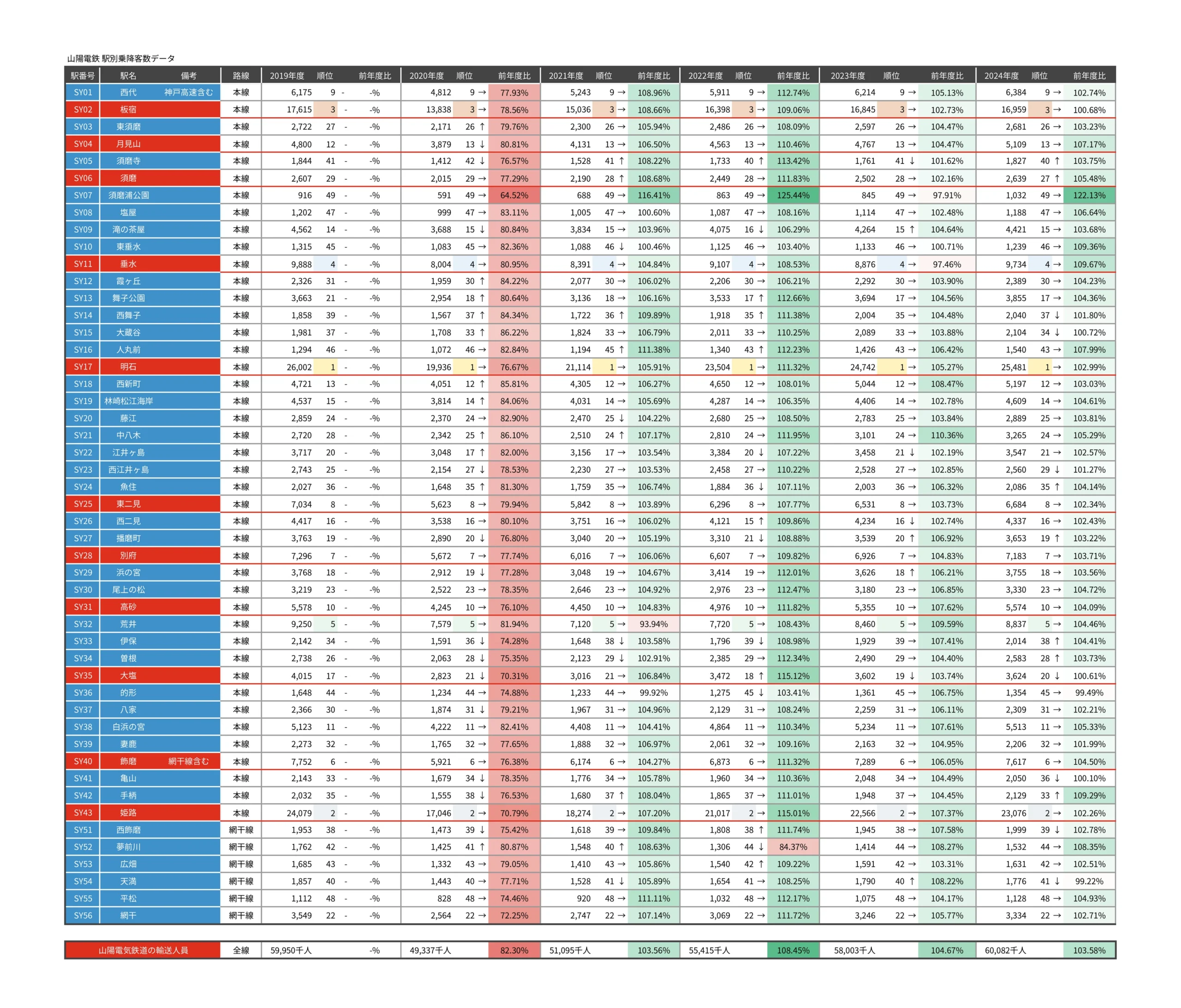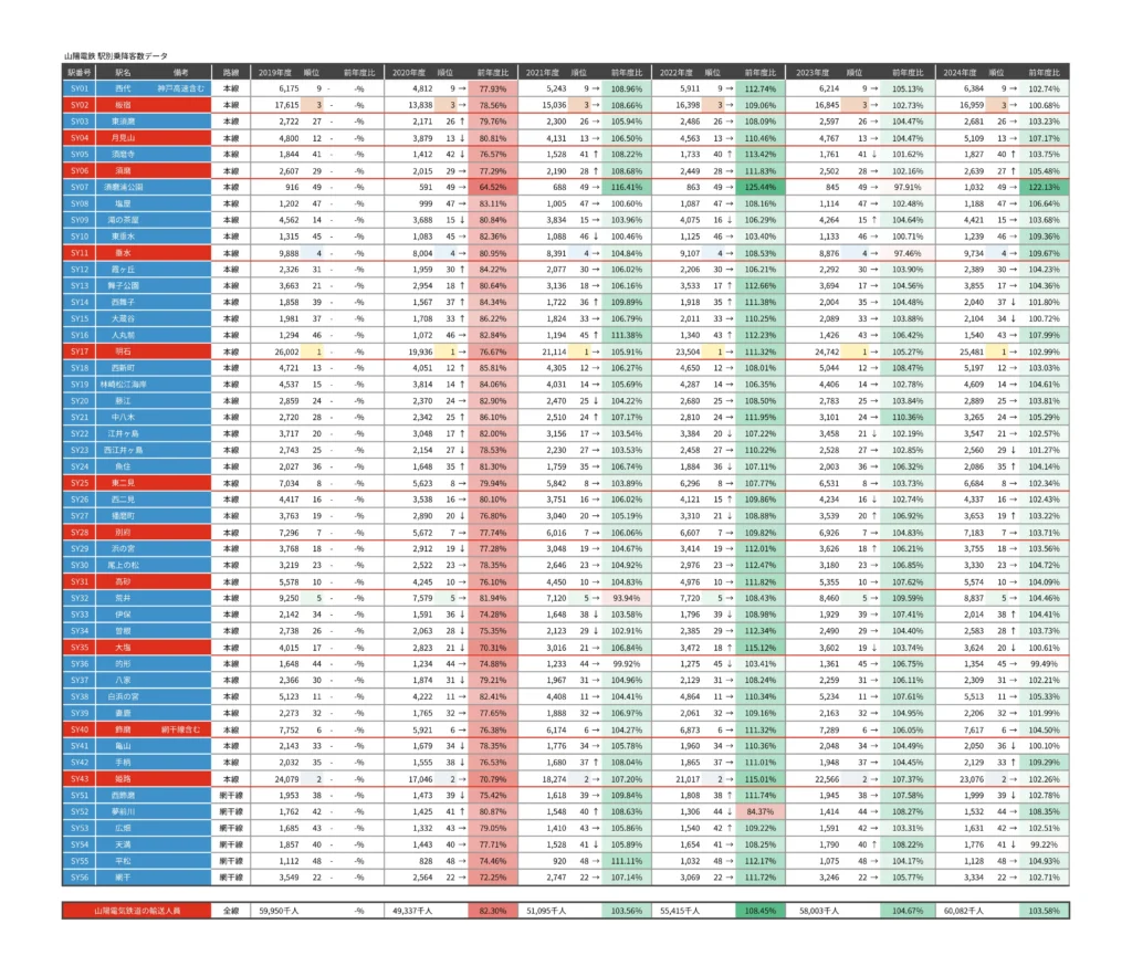 山陽電車の乗降客数データです。直近数年分を綺麗にまとめてみました。